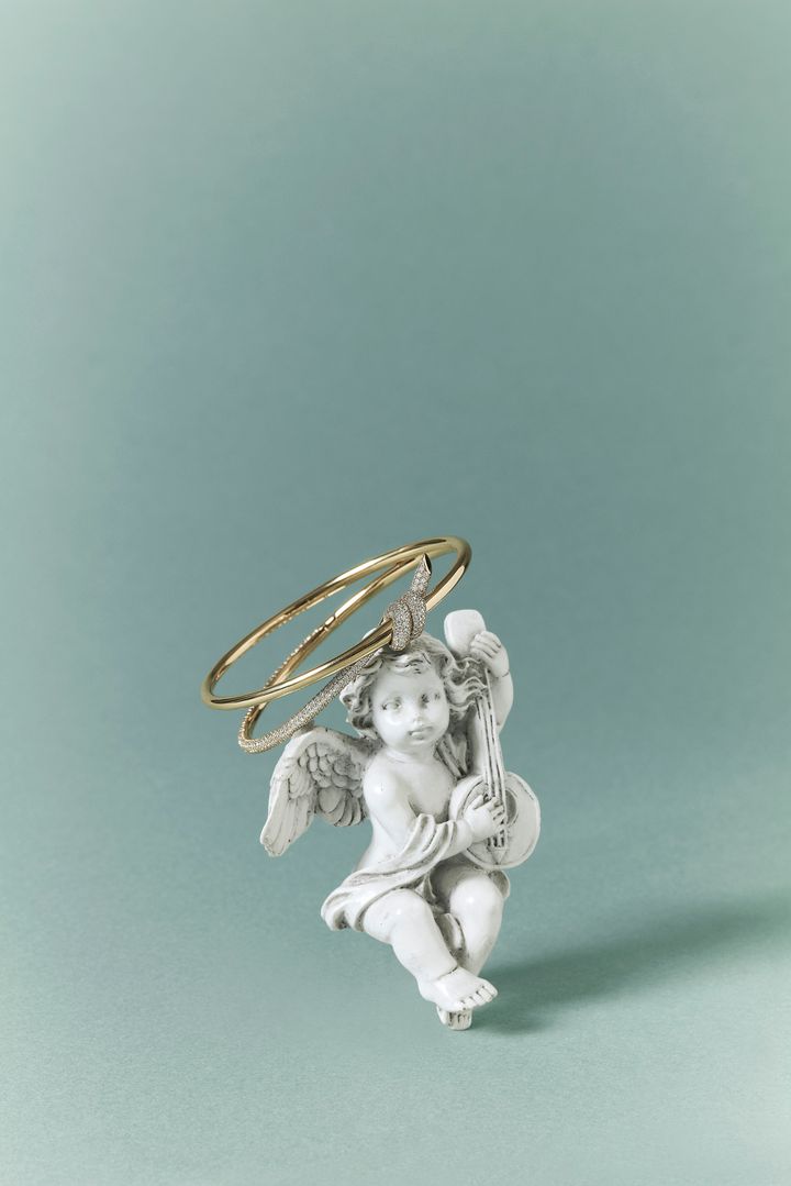 立体的な造形が印象的な“ティファニー ノット”は結び目をモチーフにしたコレクション。なめらかな曲線と磨き込まれたイエローゴールドの艶が構造美をいっそう際立たせます。結節点から伸びるパヴェダイヤモンドが、ブレスレットをドラマチックに演出。