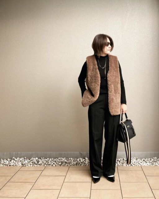 【きれいめ】ブラウンのファーベスト|黒トップス×パンツ