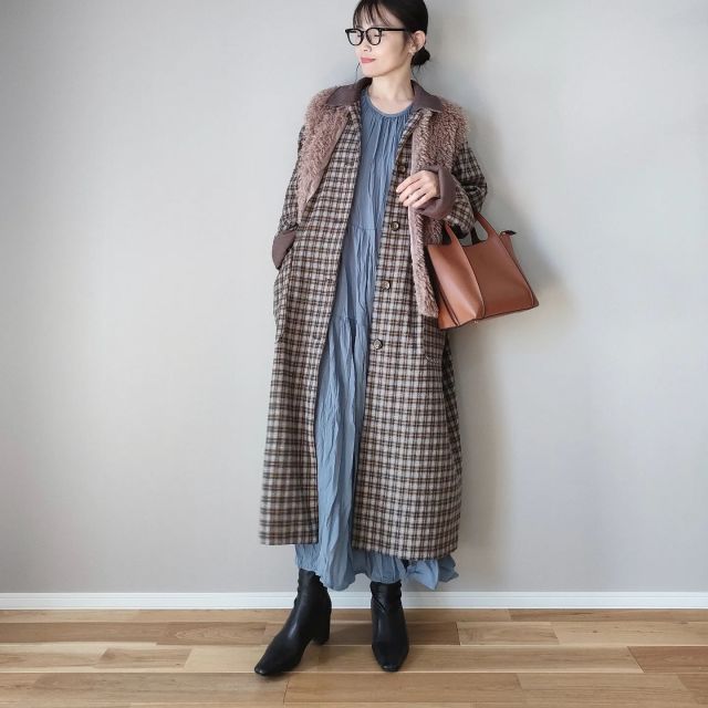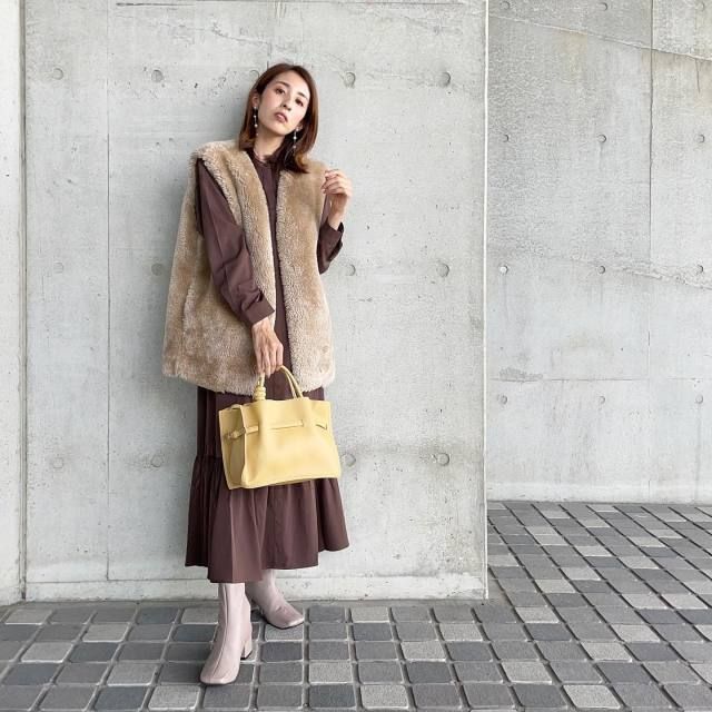 茶色のファーベストは意外にも「ティアードワンピース」と相性バツグン。ワンピースの切り替えデザインがコーデにメリハリをつけるため茶色ファーベストがのっぺり見えず、きれいめ感がグンとアップします。女性らしい雰囲気に決まるおすすめの着こなし方です。