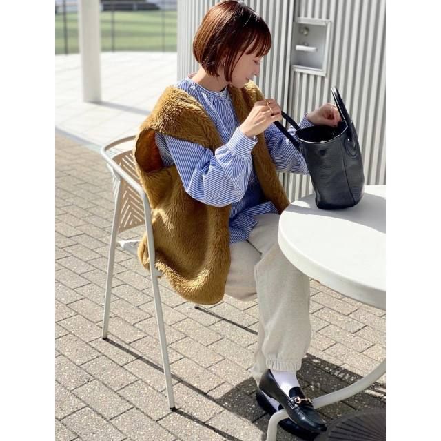 ブラウン・ベージュ・モカなど、茶系全般のファーベストにハマるのが「アウターONベスト」の着こなし。ファーベストをアウターの上に重ねるだけでコーデの鮮度がアップします。