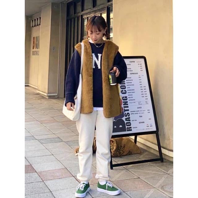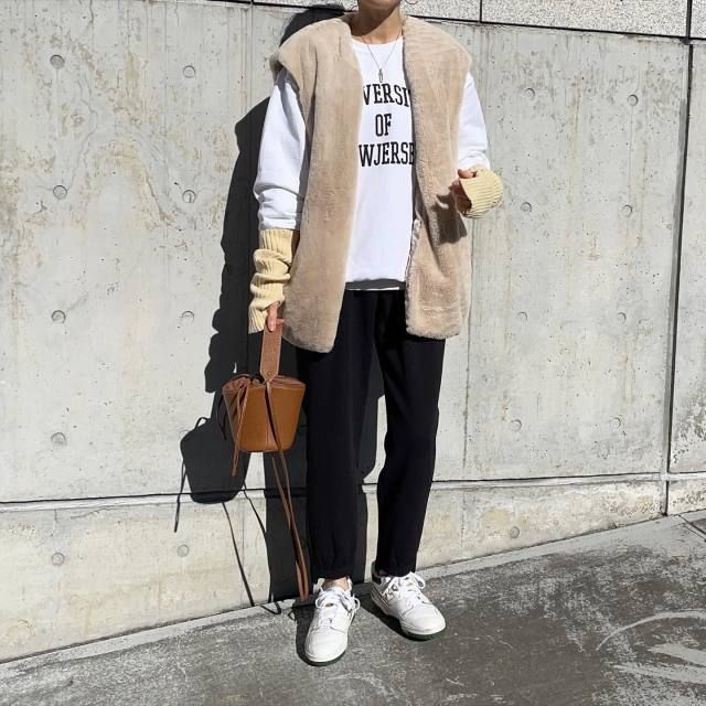 そこでおすすめのカジュアルコーデが「白スウェットパンツ」との着合わせです。爽やかさとスポーティなムードを兼ね備えたパンツは、モカのファーベストをスッキリ見せるのに効果的。しかも秋冬感のあるファーベストのおかげで、白スウェットパンツもシーズンムードに馴染みます。