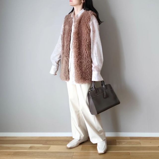 モカのファーベストに「クリーンなシャツブラウス×パンツ」を合わせれば一気にきれいめに。襟付きのシャツブラウスやカッチリしたパンツには都会的な佇まいがあり、ほっこりしがちなモカのファーベストをスッキリ着こなせます。