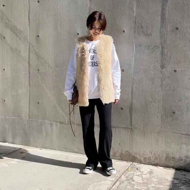 ベージュ色にクセがないので比較的どんな色とも似合いますが、より合わせやすいのは白地のTシャツ・スウェット。ここに黒パンツを投入すると淡色ベージュのファーベストが膨張せず、キリッと締まります。