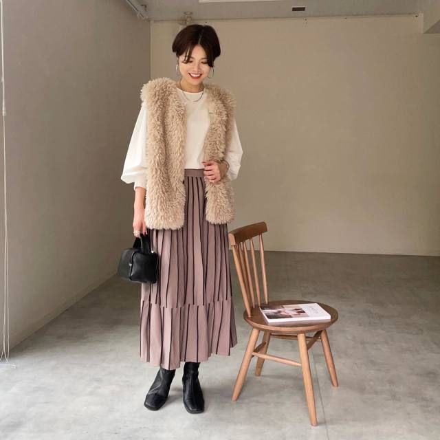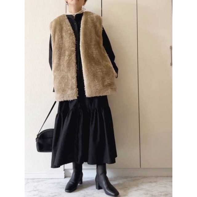 【きれいめ】ベージュのファーベスト|同系色のワンピース・スカート