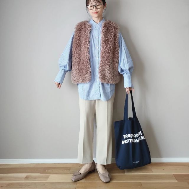 【きれいめ】モカのファーベスト|クリーンなシャツブラウス×パンツ