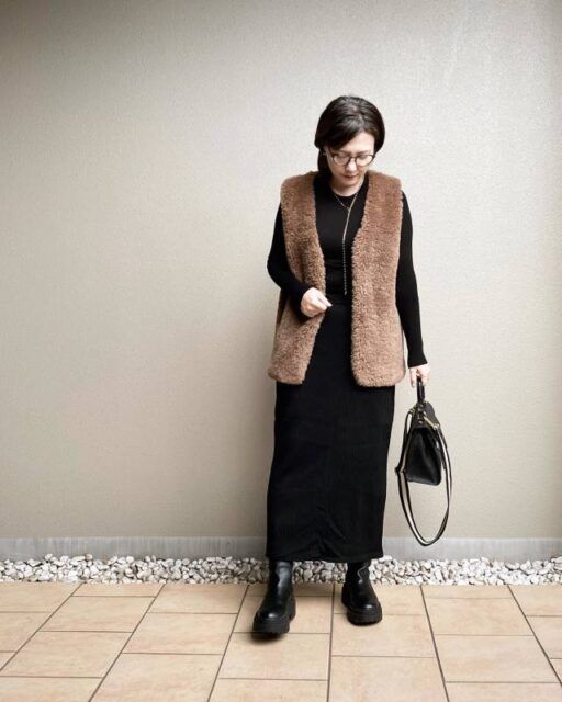 きれいめに見せたいときは「黒トップス×ボトム」との着合わせがイチ押し。インナーの上下を黒色で繋げることで、ブラウンのファーべストが引き締まります。着膨れ感を解消しつつ、黒×茶の大人っぽい配色でエレガントな雰囲気に。