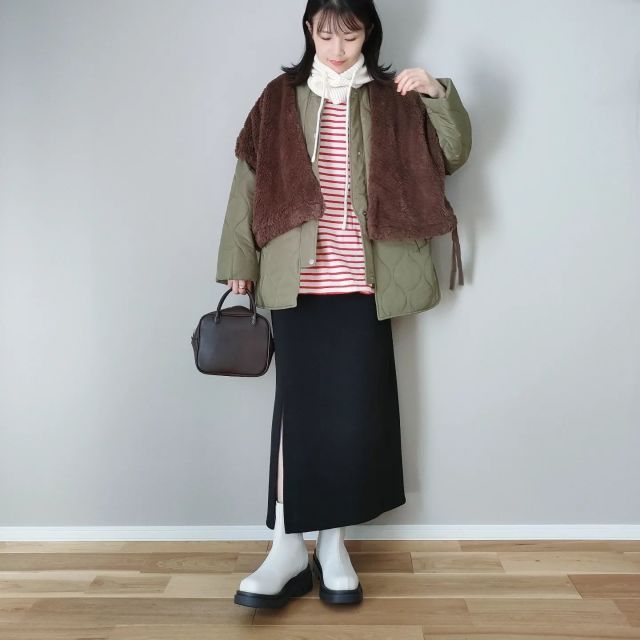 その際、それほど厚みがないジャケットやコートだと重ね着しやすいですよ。加えてカーキやブラウンなどナチュラルカラーのアウターを選べば、ファーベストがコーデに溶け込みます。