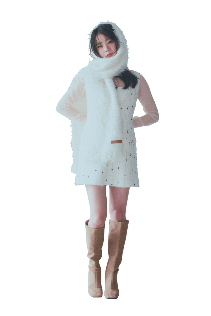 ツイードミニワンピース 29,700円、シアートップス 7,700円/ともにEIMY ISTOIRE ルミネ新宿 ルミネ2 マフラー 6,490円/dazzlin ロングブーツ 15,900円/チャールズ&キース(チャールズ&キース ジャパン)