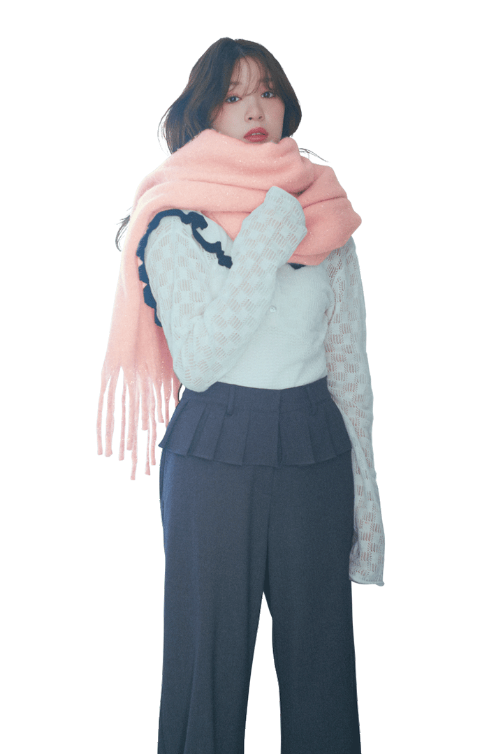 フリルニットボディスーツ 19,800円/HONEY MI HONEYスラックス 16,905円/ROSEFRANTZ(HANA SHOWROOM) マフラー 4,400円/RESEXXY