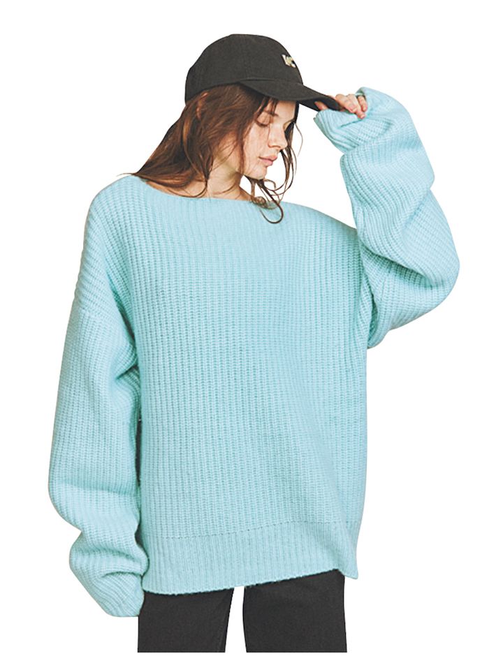 ブルーニット/y YO パンツ/YANUK(カイタックインターナショナル) キャップ/Lack of Color(ジャック・オブ・オール・トレーズ プレスルーム) 着るだけで美しい、ずるっと感のないショルダーラインに補整。白みがかったブルーの発色がオーバーサイズのゆるみすぎをストップ。