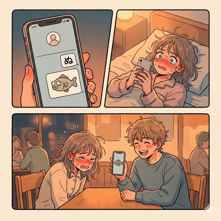 寝ぼけた指が勝手に動いたのか、意味不明な「ぬ」の一文字と、よりによって一番不気味な「白目を剥いた魚」のスタンプが送信されていたのです。