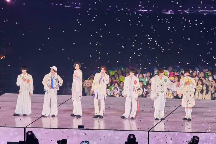 待ちに待った開演時刻。会場の照明が落とされ、巨大モニターに映し出されたのは、みっちーから始まる、なにわ男子一人ひとりの幼少期から、歴代アー写で現在に至るまでを繋いだ成長記録。なんだか「俺らがんばったで!」「夢叶えたで!」と言われているようで(泣)。ドーム公演に至るまでの軌跡が一瞬で蘇り、まもなくステージに現れる7人を迎える我々の心を一つにしてくれるオープニング映像。なにふぁむ(ファンネーム)それぞれなにわ男子を応援し始めた時期は違えど、会場中が「自担! 懐かしいね! 可愛いね! おめでとう! ありがとう!」と心の中で叫んだはず……!