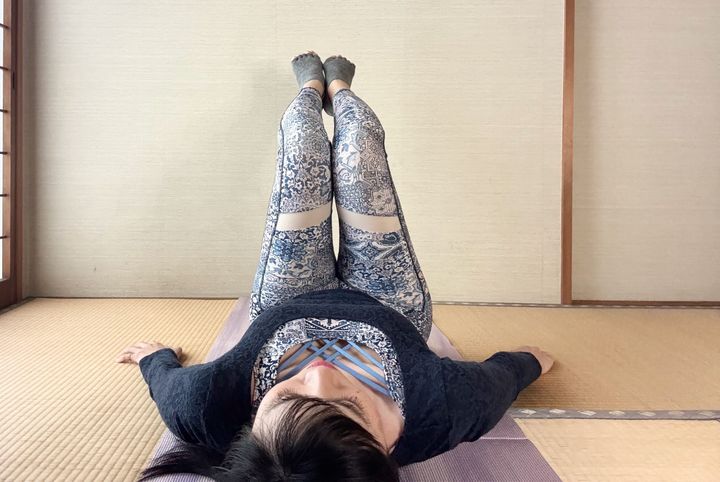 2)巻いたヨガマットの上に、仰向けに寝る。
