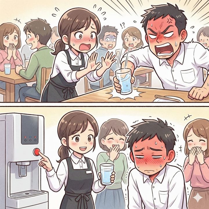 「この水、ぬるいんだけど!」と文句を言う客。だが、店員が給水機を調べると呆れた事実に気づく【短編小説】