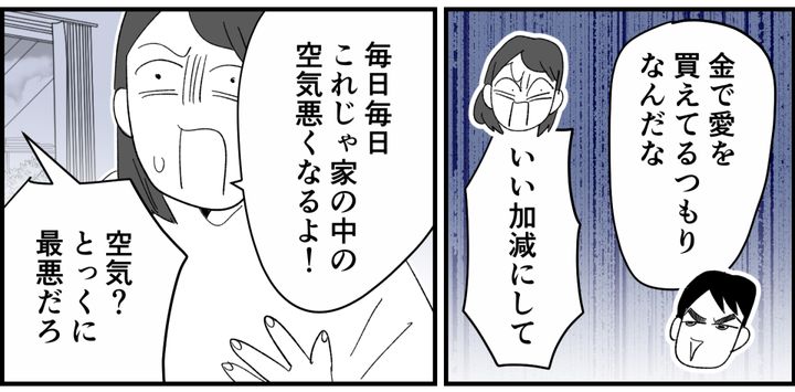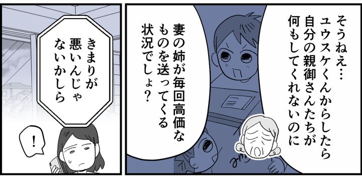 私はハヅキ。姉からキョウタとミアへ高価なプレゼントが届き、子どもたちは大喜び。しかし帰宅した夫ユウスケは、「札束で子どものほっぺたをたたいてるだけ」と失礼な物言いです。むき出しの敵意を隠そうともしません。悪口をやめるように注意すると、姉の行動を自分への当てつけだと決めつけて逆ギレしてきました。子どもたちにも当たり散らし、怒って部屋を出ていってしまいました。戸惑いつつも、子どもたちの前で感情的になるユウスケに怒りを感じます。