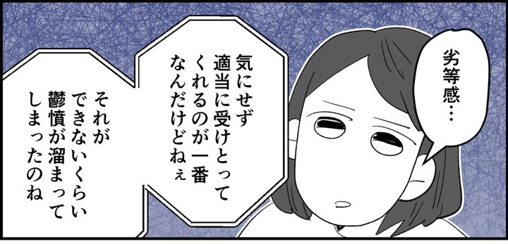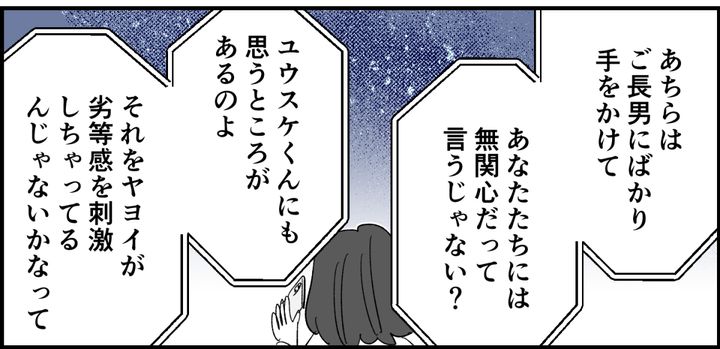 私が姉を熱心に庇えば庇うほど、かえってユウスケの劣等感を刺激して逆効果になっているのでは? と母は指摘しました。「本当はね、ユウスケくんがどーんと構えててくれたらいいんだけど。でもそれができないのが、今のユウスケくんなのよ」じゃあ一体どうしたらいいのでしょうか。すると、母はあっさりと言いました。