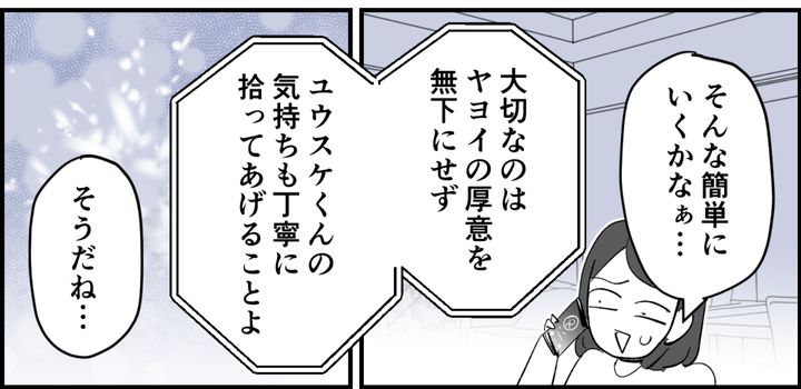 ユウスケの愚痴は聞き流し、私が姉の善意を受け止めることが大切だと。冷静になれた気がします。