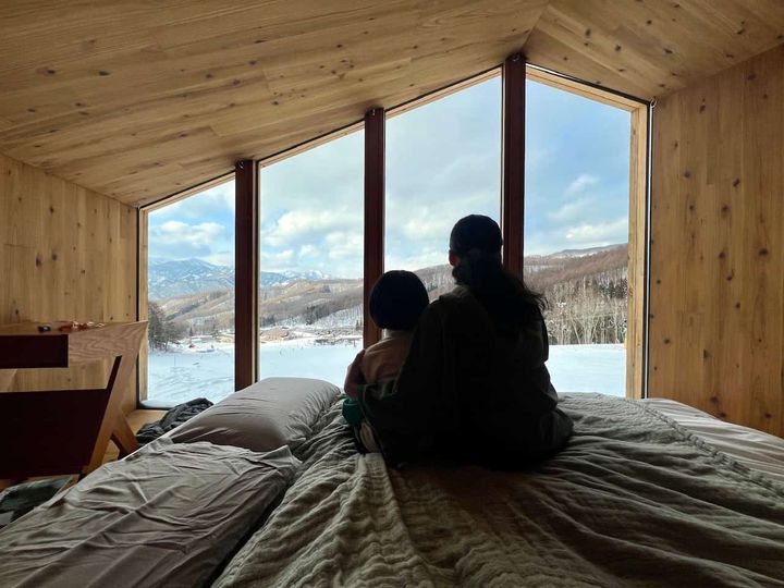 気になるお部屋の中は、全面の大きな窓があり、谷川連峰を一望でき、眼下にはゲレンデを見渡せることができます。広さはビジネスホテルのツインサイズくらいで、高めの天井と大きな窓、段差を利用した設計で、狭さを感じないデザインです。しかも、贅沢な一棟貸し。完全に独立した部屋で、お子さん連れの家族も安心して過ごすことができます。