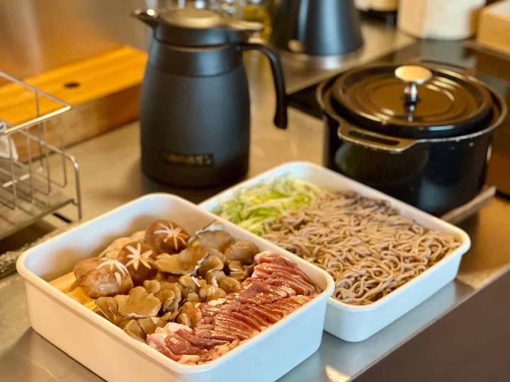 夕飯は追加料金になりますが、鴨鍋を注文することが可能です。冷蔵庫に具材が入っていて、出汁も付いてくるので、お鍋で温めるだけ。特に、子連れだと、スキーや雪遊びでクタクタのあとに、食事に出かけるのは大変なので、とても助かります。調理が可能なので、連泊する場合は、持ち込みの食材でお好みの料理をすることをお勧めします。朝食は付いていませんが、パンなどを持ち込んで軽く済ませました。前日の夜の鴨鍋のスープが残ったので、一緒に温め直して食べると十分な朝食になります。