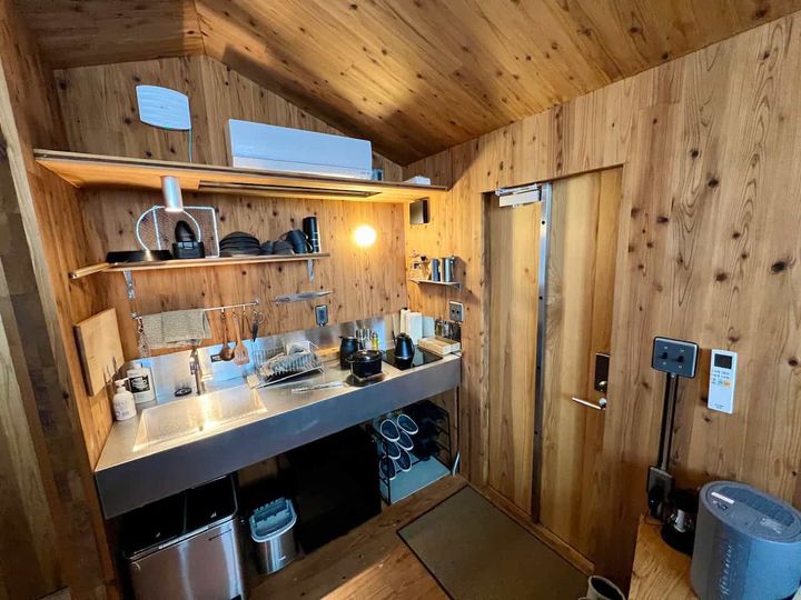 部屋にはキッチンが完備。フライパン、鍋、包丁など調理器具やカトラリー、お皿などが揃っています。コンパクトながらも必要なものは全て揃っているので、特にSTORY世代には嬉しい設備です。コーヒー豆とコーヒーミルもあるので、雪景色を眺めながら淹れたてのコーヒーを楽しむことができます。