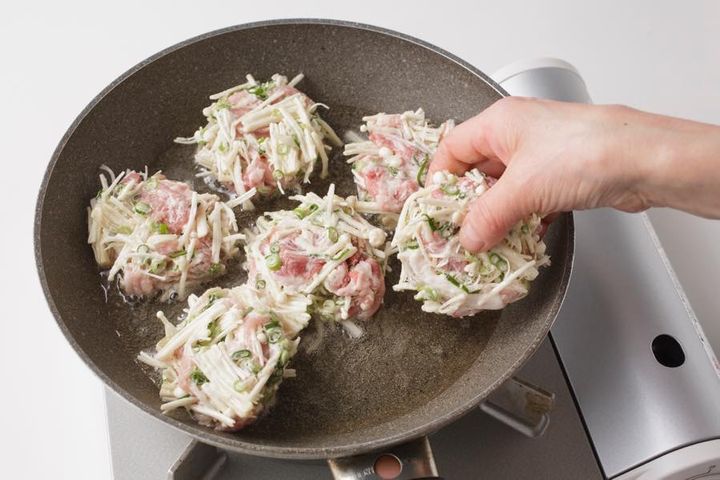 3. えのき1袋で節約レシピ!少ない油で焼くから簡単『豚こまとえのきの焼きかき揚げ』