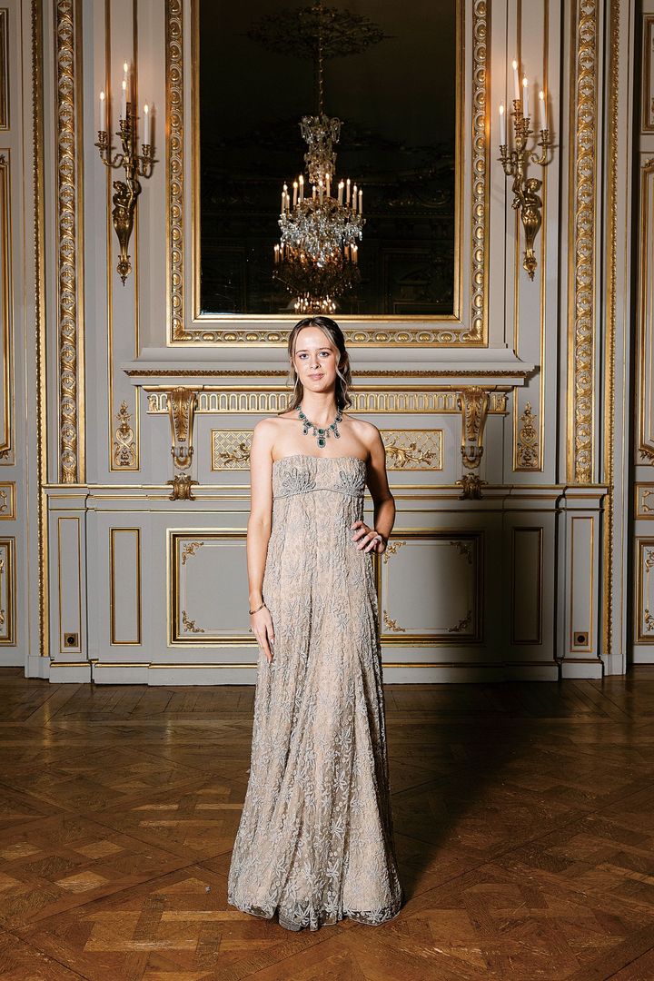 ふたつの名家の流れをくむ20歳。ロンドン大学で心理学を専攻するエリニは、国際教育リーダーシップ会議でウェルビーイングやコミュニケーション支援について発表したことも。バックコンシャスなドレスは、英国のデザイナー、デボラ・ミルナーが手掛けたもの。