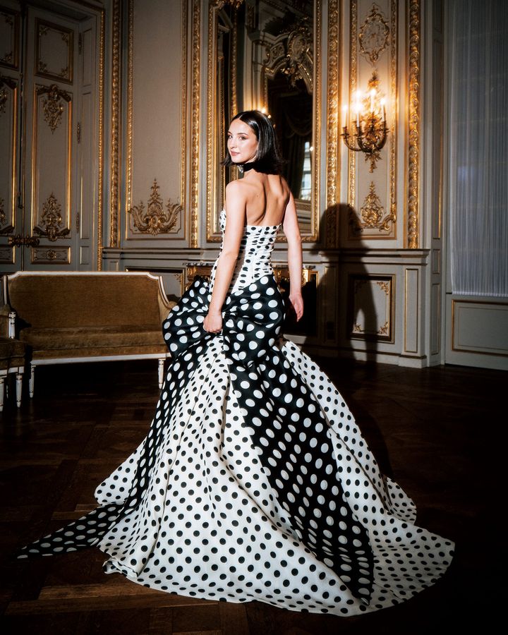 投資家の父と起業家の母をもち、祖母はファッションデザイナーという華やかな家系に生まれたカロライナ。ファッションと音楽をつなぐキャリアを思い描きながら、南カリフォルニアの大学で音楽ビジネスとグローバルコミュニケーションを学んでいます。バルでひときわ注目を集めたモードなドット柄のドレスも、祖母のブランドであるキャロリーナ ヘレラのもの。