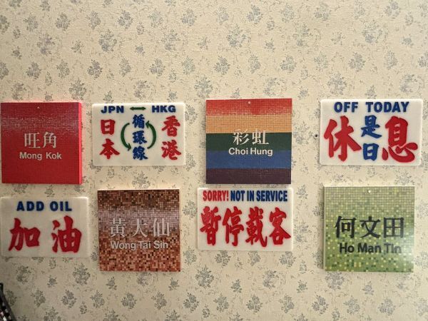 お手洗いの壁にも香港の地名や中国語のプレートがずらり!