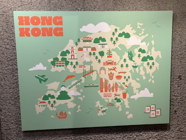 階段の途中には、香港の地下鉄の路線図や、香港の名所がイラストで描かれた地図がお出迎え。