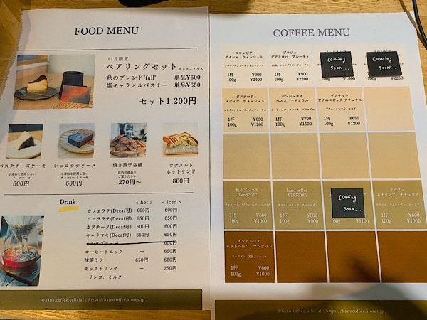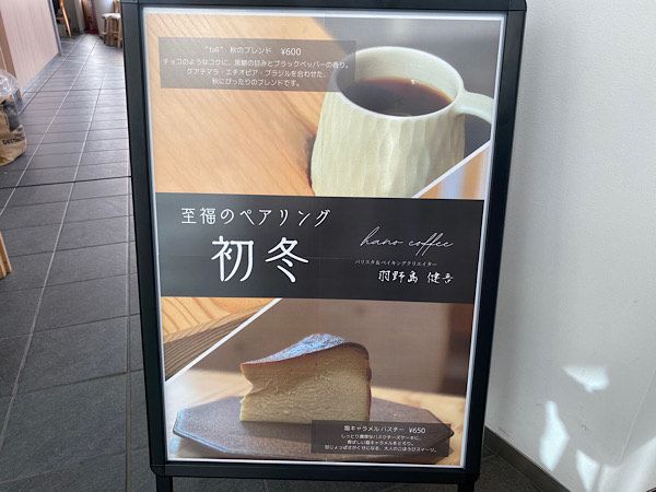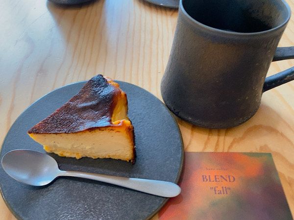 季節のチーズケーキにはそれに合わせたオリジナルブレンドコーヒーとのセットもあります。 今回は「ノーマルのバスクチーズケーキ」と「マンデリン」、「塩キャラメルバスクチーズケーキ」とペアリングコーヒーの「fallブレンド」をいただきました。