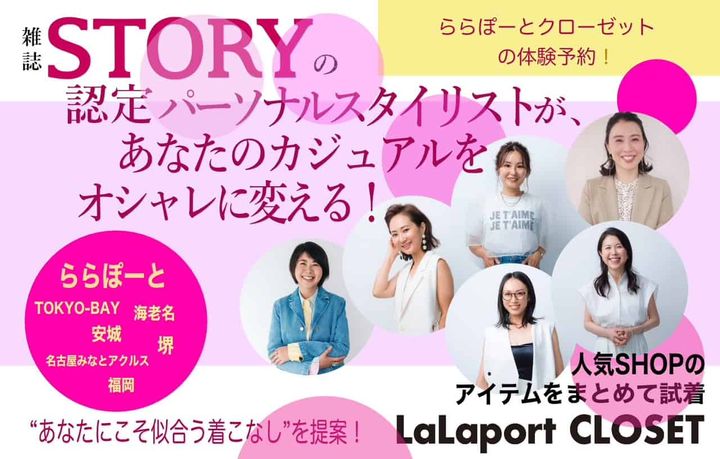 「STORYが街に出る!」をコンセプトにスタイリングサービスを行うイベントです。誌面でも活躍中のSTORY認定パーソナルスタイリストたちが、あなたの体型や雰囲気に合う服を探しながら、トレンドの着こなしをアドバイスします。会場はららぽーと内のさまざまなブランドの中から選りすぐりの旬を集めたセレクトショップ「LaLaport CLOSET」。気にいった服は、その場でららぽーとのECサイト〈&mall〉から購入できるので、手ぶらでSHOPPINGが楽しめます。