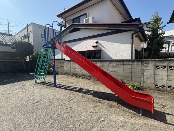 明るい赤色が特徴的な滑り台ですね。大きくて存在感のある滑り台はやはり公園の王者な感じがします。登って滑るだけでも楽しいのに、風を切る感覚がなんとも爽やかで気持ちがいいものですよね。