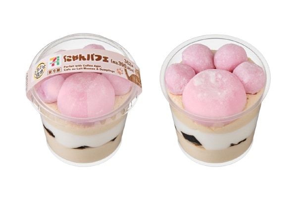 「にゃんパフェ」(390.96円)は、カフェオレムースにぷるぷる食感のコーヒー寒天、軽いくちどけのミルクムース、カフェオレホイップを重ねました。ピンク色の肉球をイメージした団子とミルクあんホイップ大福をトッピングして仕上げています。