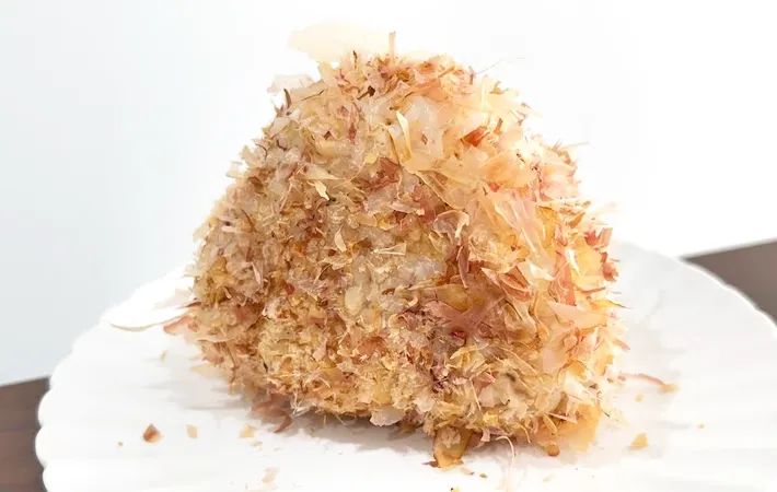 皿の上にカツオ節を広げ、おにぎりをコロコロと転がすようにすると、全面がカツオ節で覆われた『毛並みのふさふさしたおむすび』のようなビジュアルになりますよ。