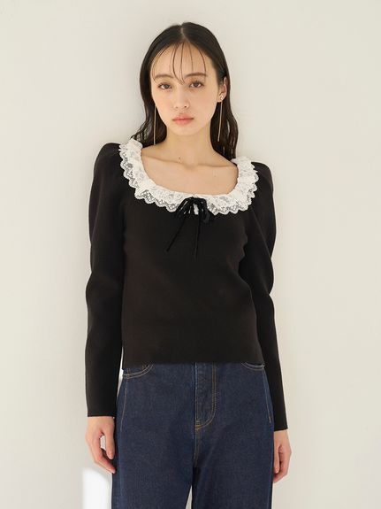 胸元のリボンは取り外し可能な、華やかなニット。大きく開いたデコルテを美しく2重のレースが彩ってくれます。【USAGI ONLINE限定】フリルネックニットプルオーバー/SNIDEL
