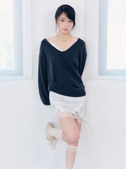 スエット見えするMilaOwenの人気ニット+レースインナーのセット。中のレースは、キャミではなくTシャツタイプになっている。↓