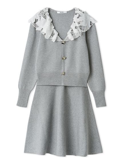ニットのセットアップのトップス部分に、デコラティブなレースがついた、華やかセット。上品な丈感のミニフレアなのも嬉しい。現在グレーのみの人気アイテムです。ミニニットセット/SNIDEL