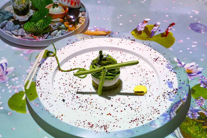 最後は、日本のチイサノ・タカヒロシェフによるデザート。鯉が悠然と泳ぐ池の上を舞台に、和の美意識を感じさせる所作でデザートを完成させます。とろけるような食感の抹茶のメレンゲと和栗のムースを用いた「抹茶のモンブラン」は、花吹雪が舞う中サーブされる芸術的な一皿。食後は、来場客の投票によって優勝シェフを決定する楽しい体験も待っており、どのシェフが優勝するかによってエンディングの映像や音楽が異なります。