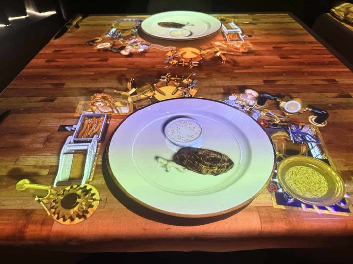 テーブルの上をシェフたちが飛び回り、目の前で調理を披露。3Dアニメーションで鮮明に映し出されるバーチャル料理が完成すると、実際の料理がサーブされます。