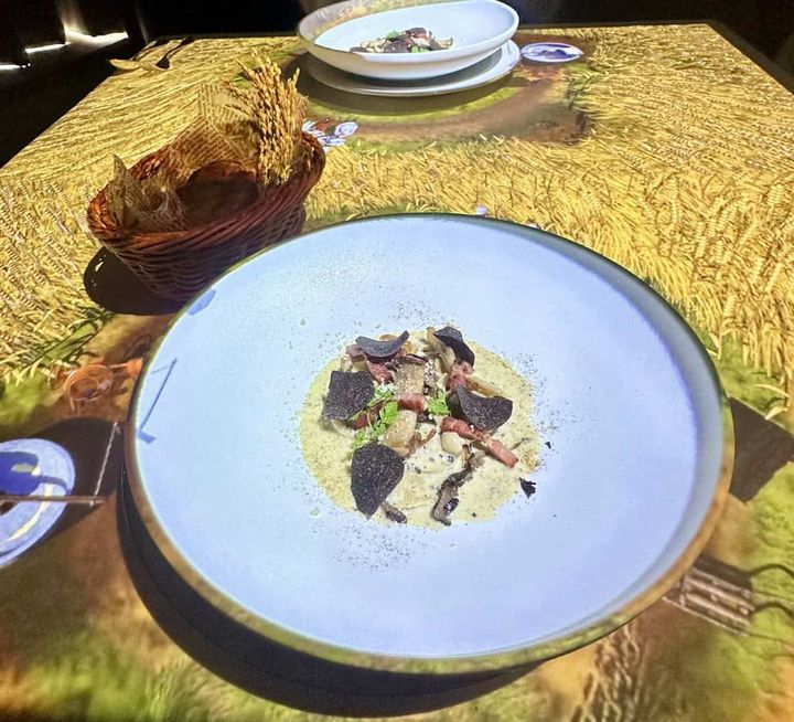 3皿目(写真一枚目)は、芸術の国イタリアのピッコロ・ルチアーノシェフが登場し、トスカーナの小麦畑でトリュフ豚が掘り当てたトリュフとキノコを贅沢に使った、濃厚なクリームソースのラビオリを披露。サーブされた瞬間、芳醇なトリュフの香りが立ち昇る絶品パスタです。