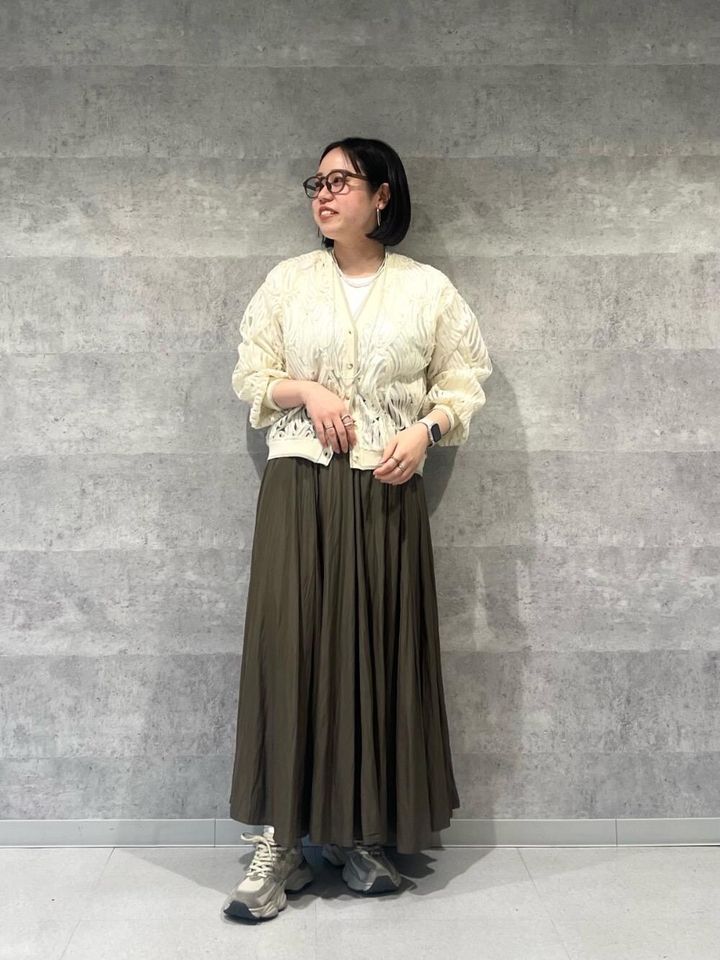 細かなパーツにラメが入っている華やかなカーディガンや、揺れ感のきれいなスカートはエレガントな印象。一方で足もとはスニーカーなので歩きやすさも抜群。服と同様、淡い色合いを選ぶことでスポーティーにならずに仕上がりました。