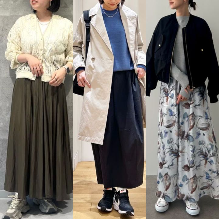 スカートでフェミニンな雰囲気を楽しみながら、足もとはスニーカーでたくさん歩ける! そんないいところ取りの、ほんのり甘めなエレガントコーデをご紹介します。