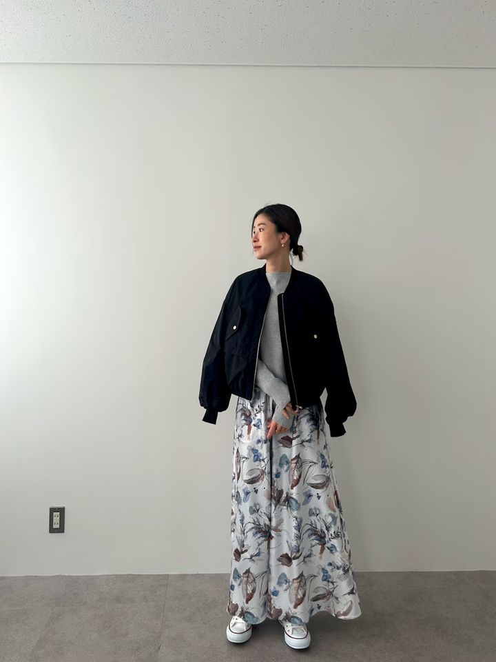 華やかなプリントスカートをカジュアルダウン