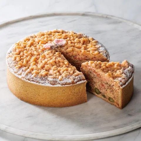 「帝国ホテル 東京」のホテルショップ「ガルガンチュワ」に登場する「桜のタルト」は、桜の塩漬けと桜色のシュトロイゼルが彩る、表面の焼き色まで美しい一品。タルト生地には、桜の花びらと葉の塩漬け、さらにうぐいす豆を加えて焼き上げており、ほんのりとした塩気とやさしい甘みが絶妙なバランスに。外はサクッと香ばしく、中はしっとりとした食感で、桜の香りが口いっぱいに広がる。春の手土産に選びたくなる、上品な味わいだ。