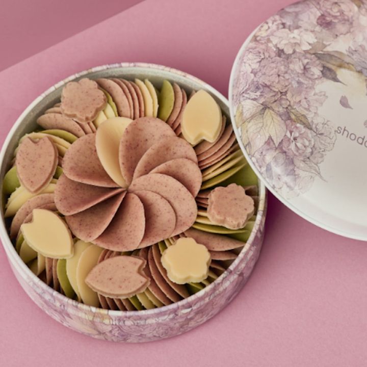 「ショウダイビオナチュール」で人気を誇る、花びらをモチーフにしたペタルチョコレートから、春限定缶が登場。「ぺタル桜彩華」は、満開の桜が咲き誇る華やかさと、散り際の儚さまでも表現した、情緒溢れる一品だ。缶を開けると、淡い3色のペタルチョコレートが幾重にも重なったビジュアルが美しい。ピンク色は、桜と木苺を合わせた、甘酸っぱく可憐な味わい。葉桜色は桜の葉と抹茶の香りを重ね、ほろ苦さと青みのニュアンスを感じさせる。白桜色は、トンカ豆の芳醇な香りが印象的な一枚。それぞれが異なる個性を持ちながら、ひと缶の中で春の移ろいを描き出している。パリッと軽やかな食感とともに、口に入れた瞬間からやさしい甘みと繊細な香りがふわりと広がる。