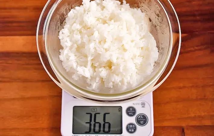 一方、豆腐を加えずに炊いた1合の米は、366gになりました。