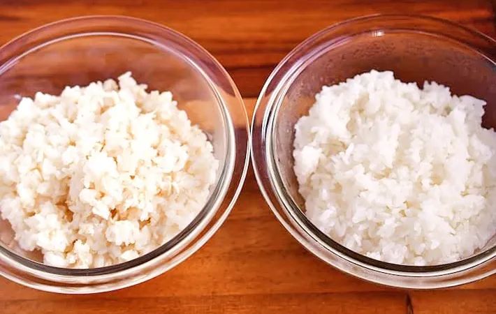 白米だけのご飯と並べてみると、『豆腐のかさましご飯』は少しだけ黄みがかっているように見えます。