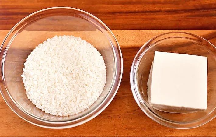 左が豆腐入り、右が米だけ(撮影:小泉明代)