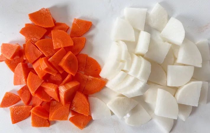 まずは、具材をそれぞれカットしていきましょう。鶏肉は一口大に、ニンジンと大根は皮を剥いてイチョウ切りにします。