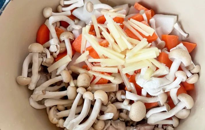 鶏肉の色が変わってきたら、ニンジン、大根、シメジ、ショウガも投入してさらに炒めます。